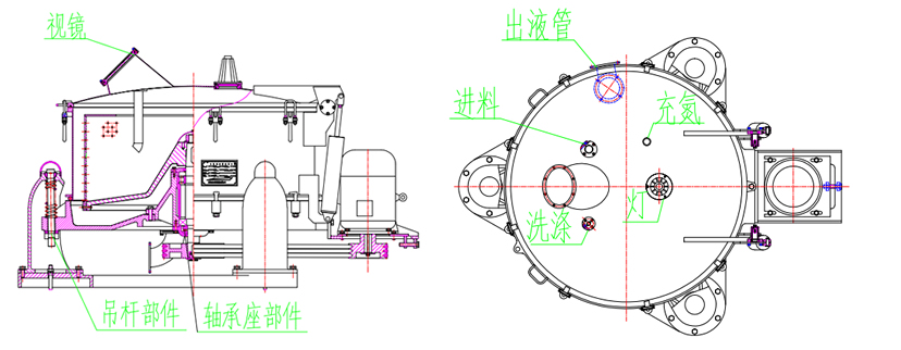 3.大翻蓋設(shè)計(jì),平衡缸助力,開(kāi)蓋輕便省力。上蓋設(shè)置,進(jìn)料、水洗、視鏡、防爆燈、充氮口。